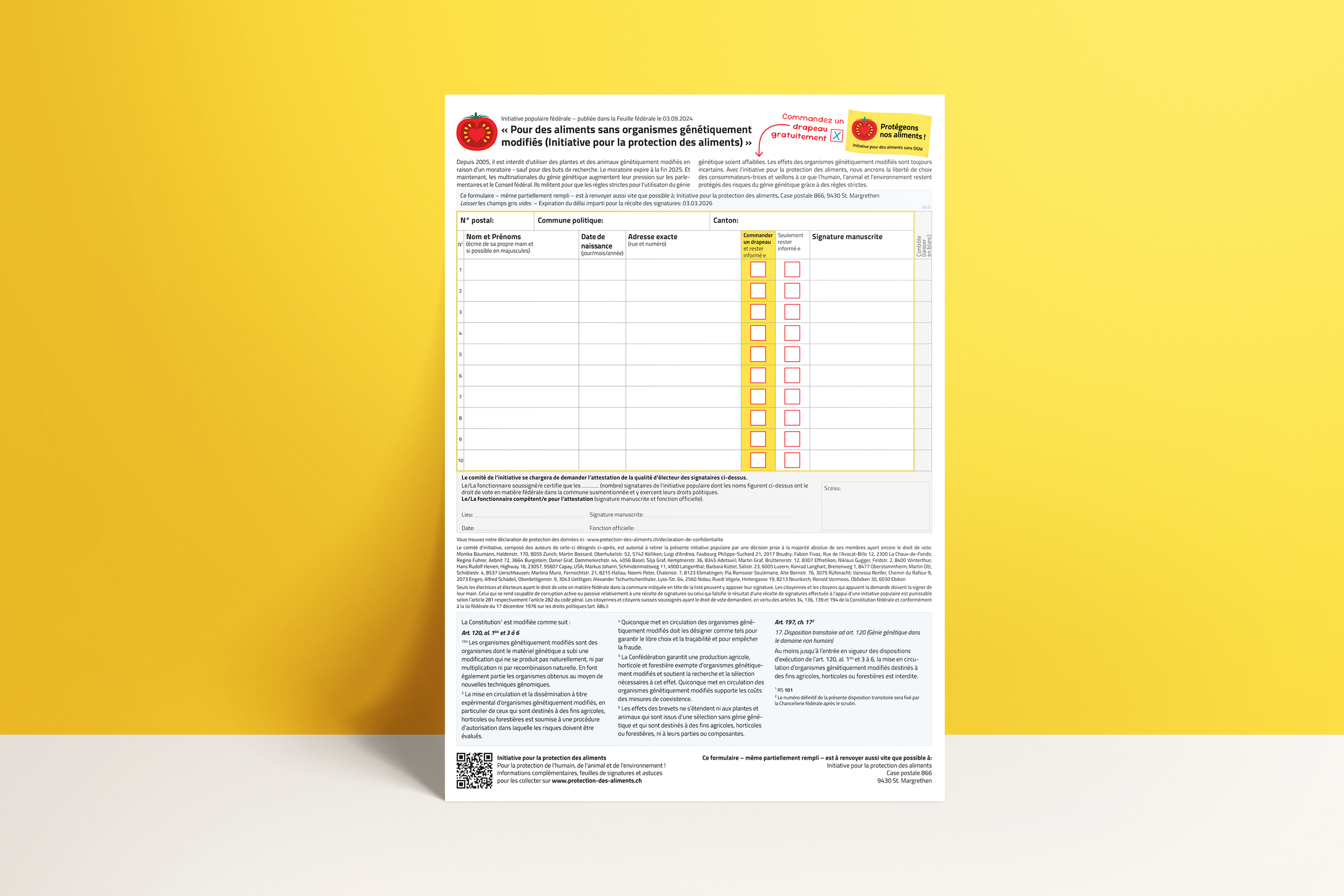 L'initiative pour la protection des aliments inscrit dans la Constitution l'obligation d'étiqueter les OGM tout au long de la chaîne de création de valeur et garantit ainsi la liberté de choix des consommateur·ices et des agriculteur·ices.